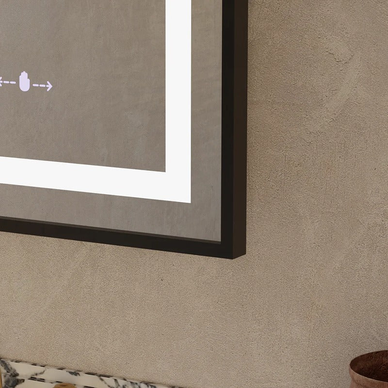 Oglindă de baie cu ramă subțire neagră și LED uniformă, ce oferă un contrast elegant și un aspect.