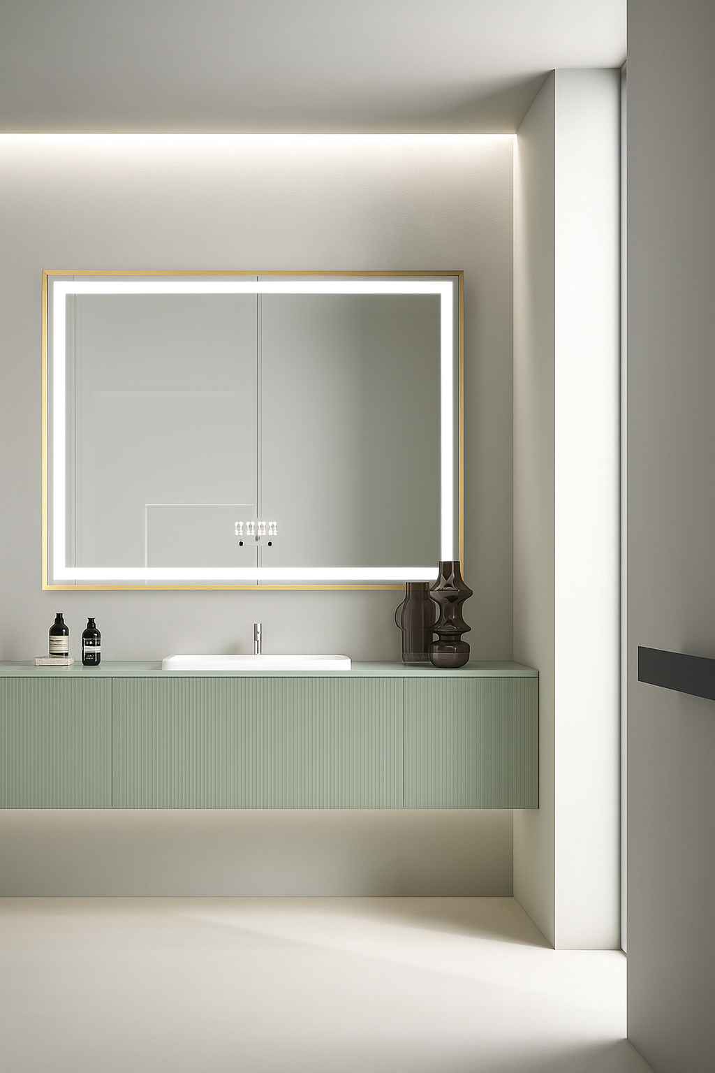 Oglindă de baie cu design rafinat, definită printr-o ramă subțire aurie și iluminare LED uniformă pe contur. Aspectul elegant și finisajele fine sau transformă într-un element de decor modern, perfect pentru băi contemporane sau spații cu accente premium.