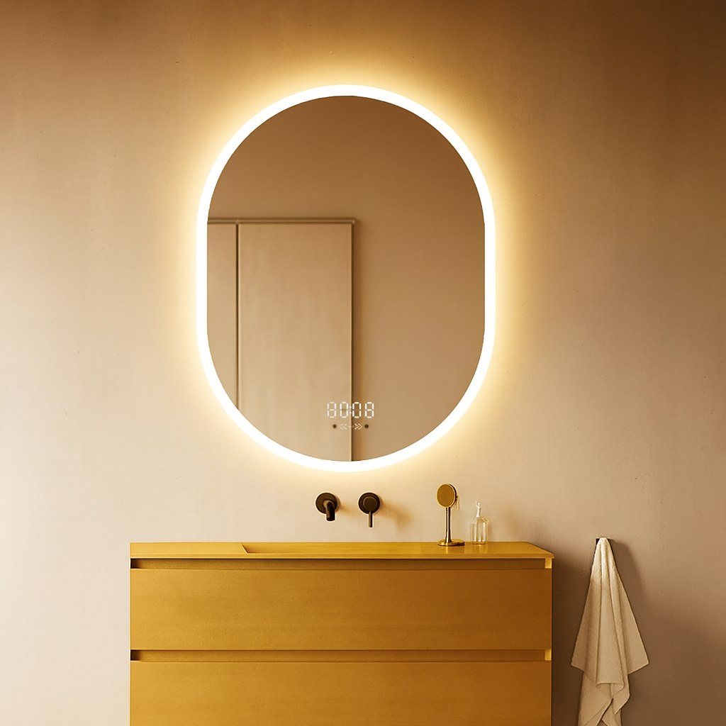 Oglindă de baie cu formă ovală și iluminare LED perimetrală, ce oferă lumină uniformă și plăcută. Designul elegant și liniile rotunjite aduc finețe și echilibru în orice spațiu modern.