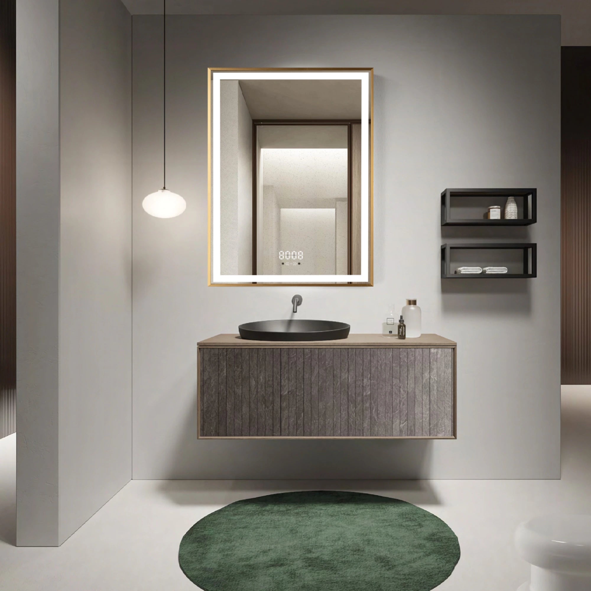Oglindă de baie cu ramă fină aurie și iluminare LED perimetrală, ce oferă un echilibru perfect între rafinament și funcționalitate.