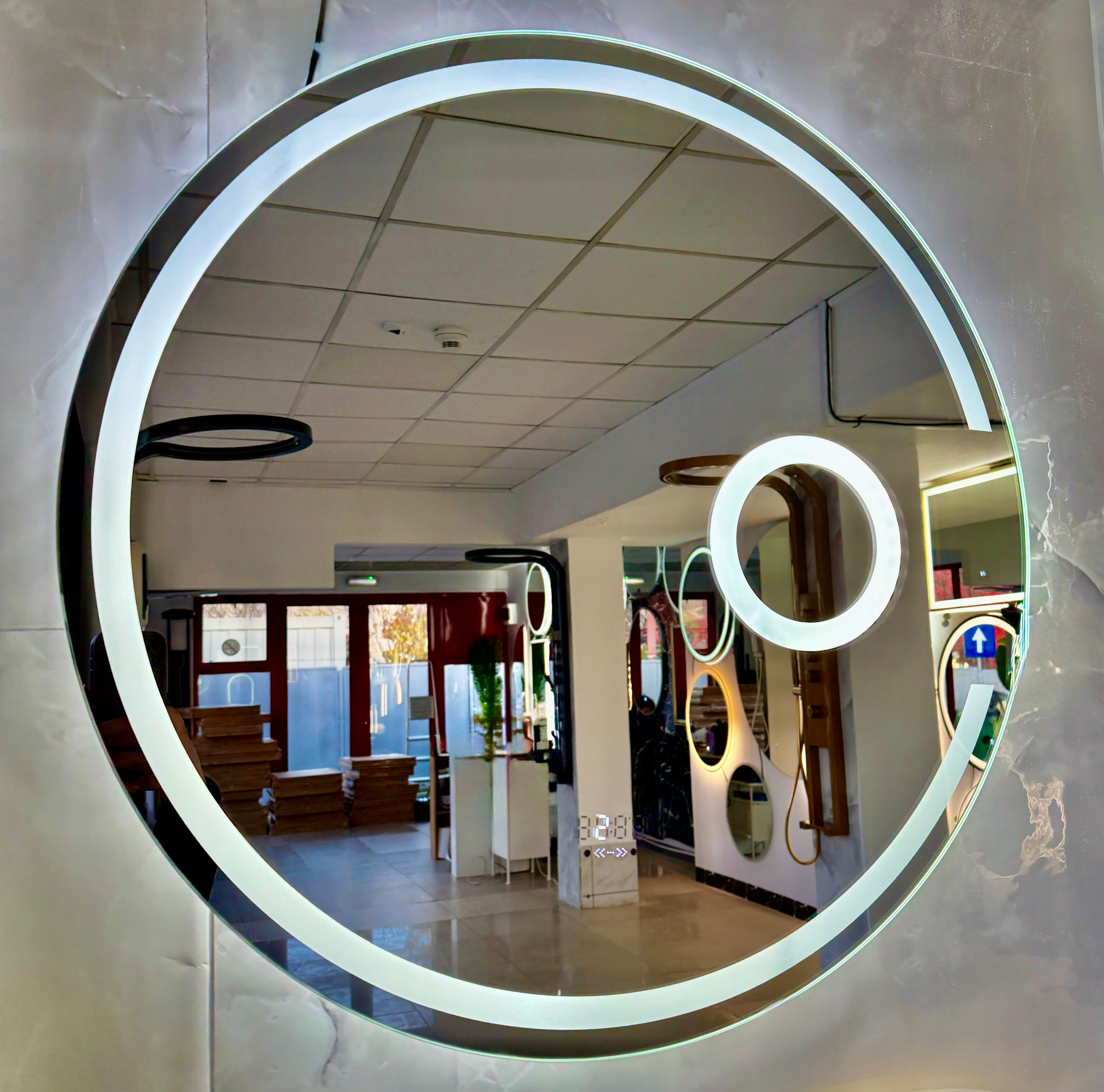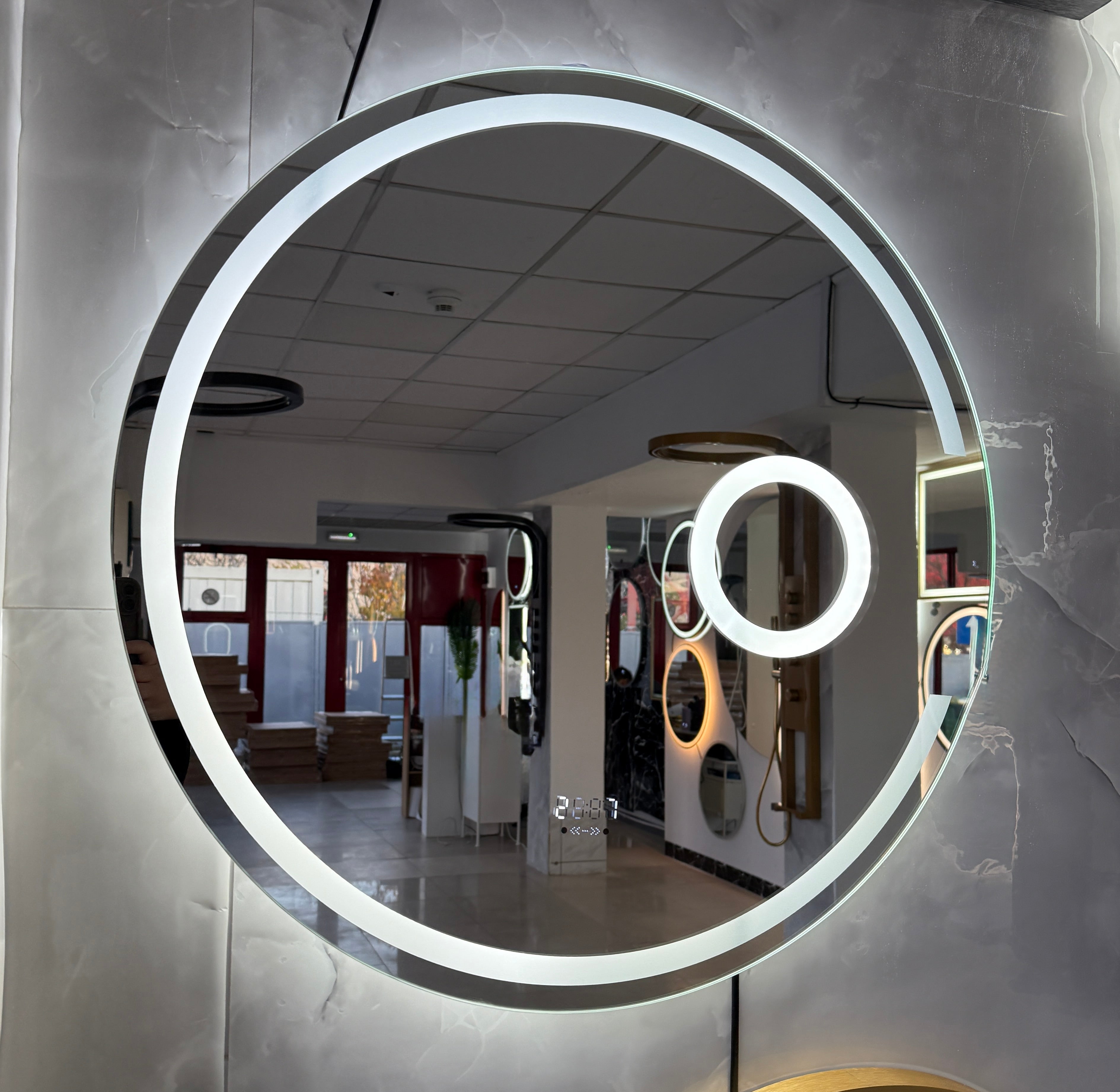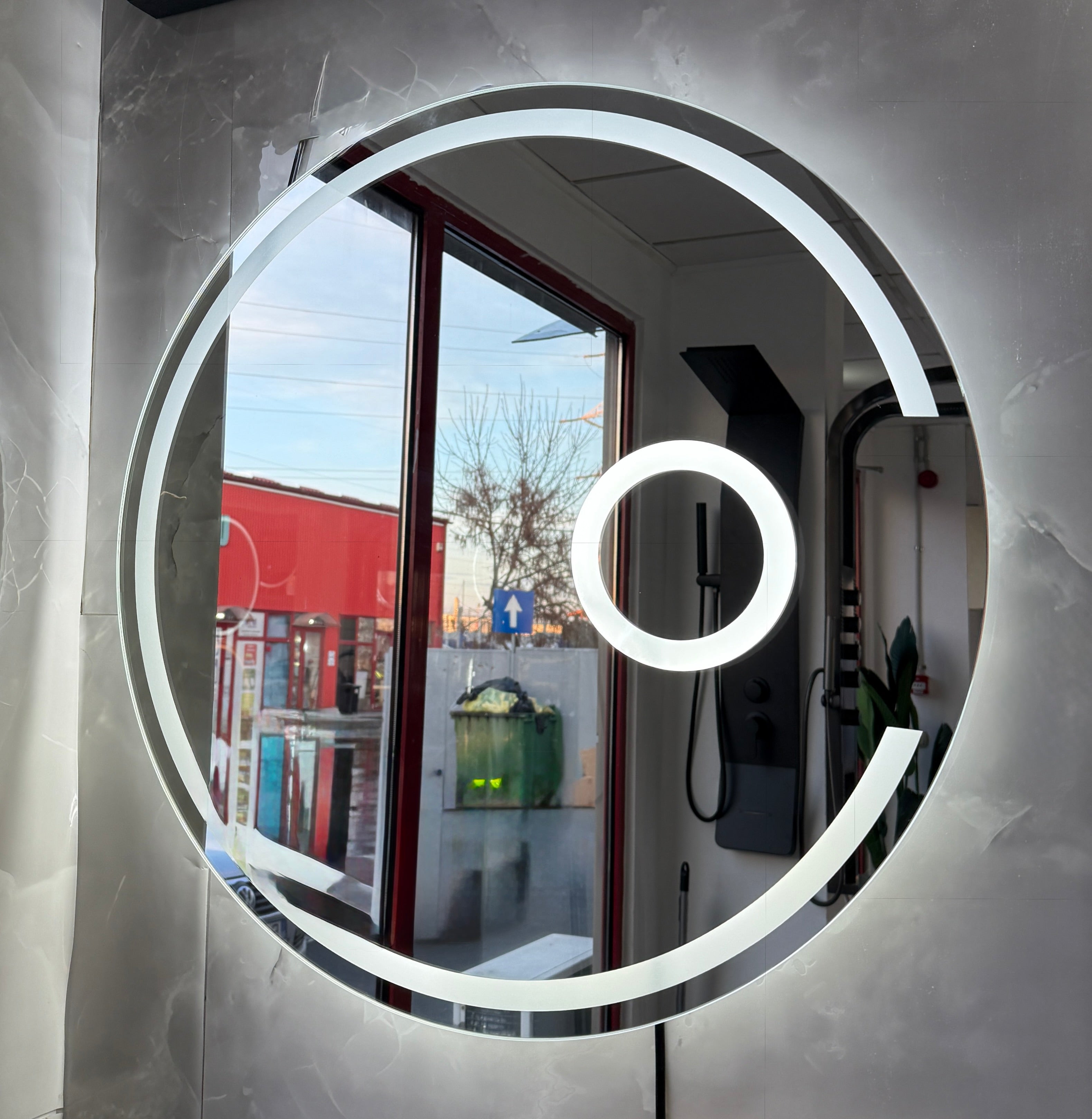 Oglindă rotundă de baie cu design modern și iluminare LED creativă, dispusă în formă geometrică dublă. Liniile luminoase adaugă profunzime și originalitate, transformând oglinda într-un element decorativ central.