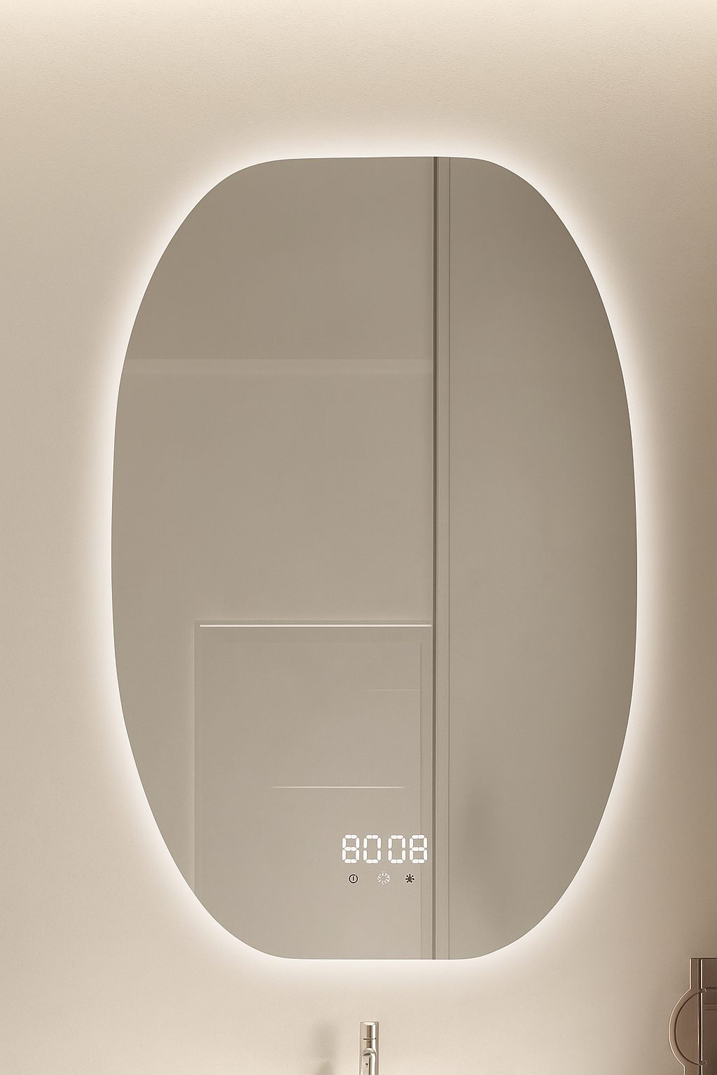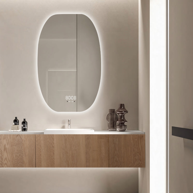 Oglinda LED 60×80 cm Ovala, Senzor Miscare Premium – 3 Tipuri de Lumina, Dimabila, Ceas & Temperatura, Dezaburire