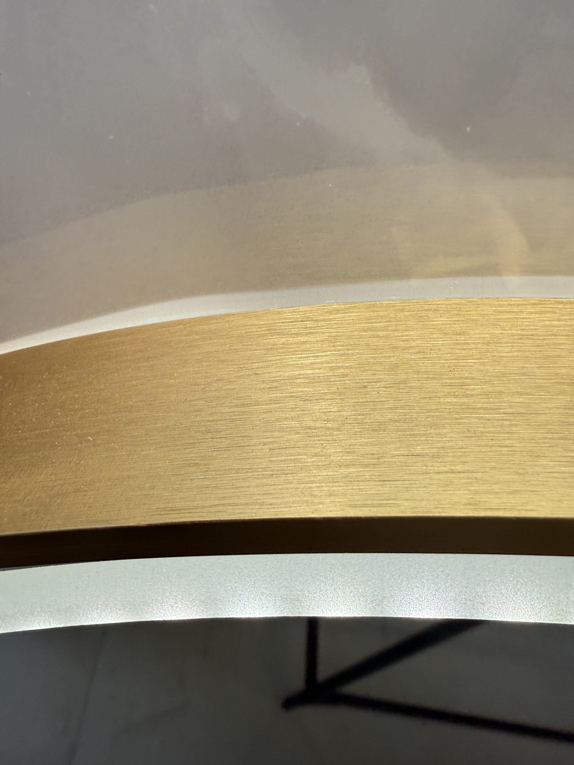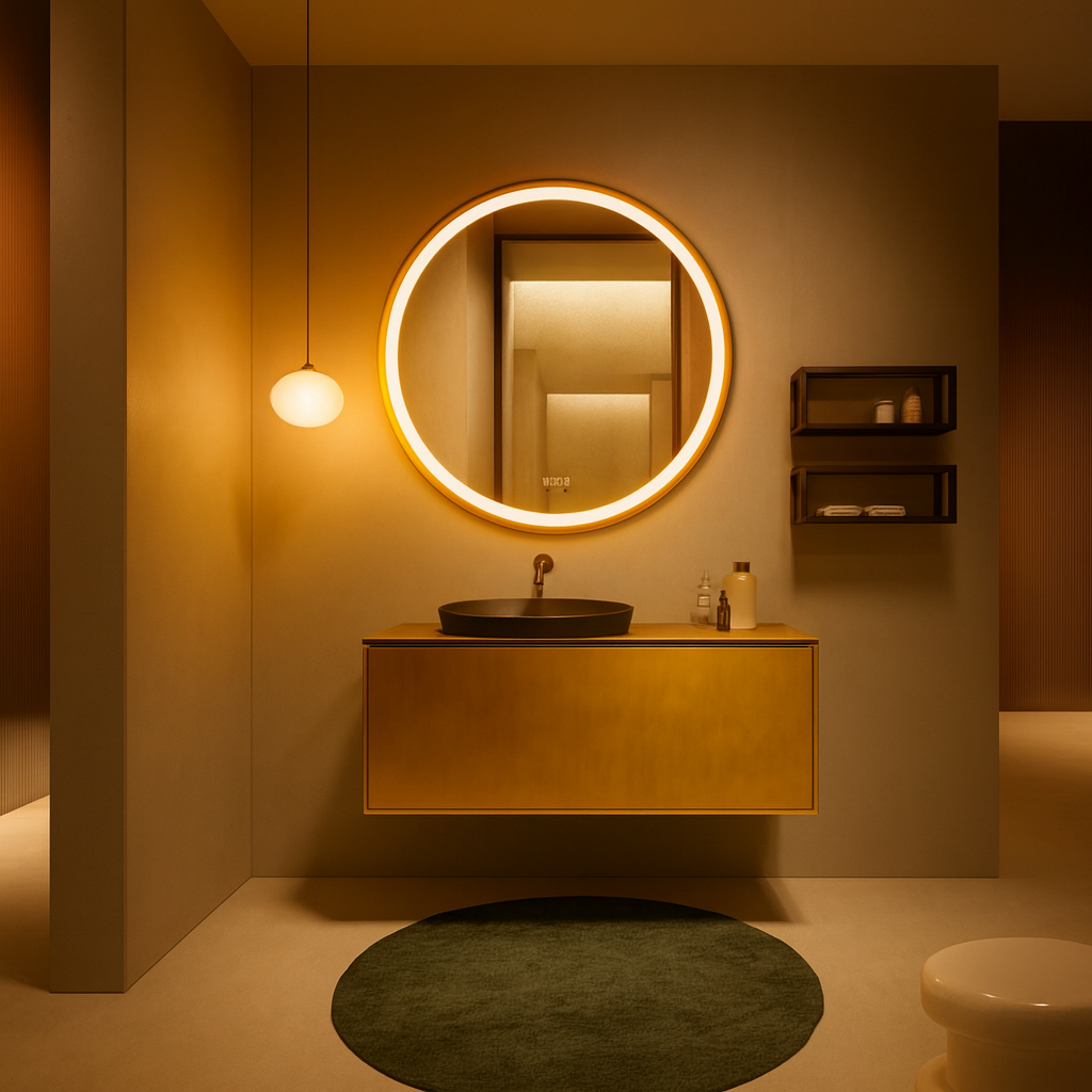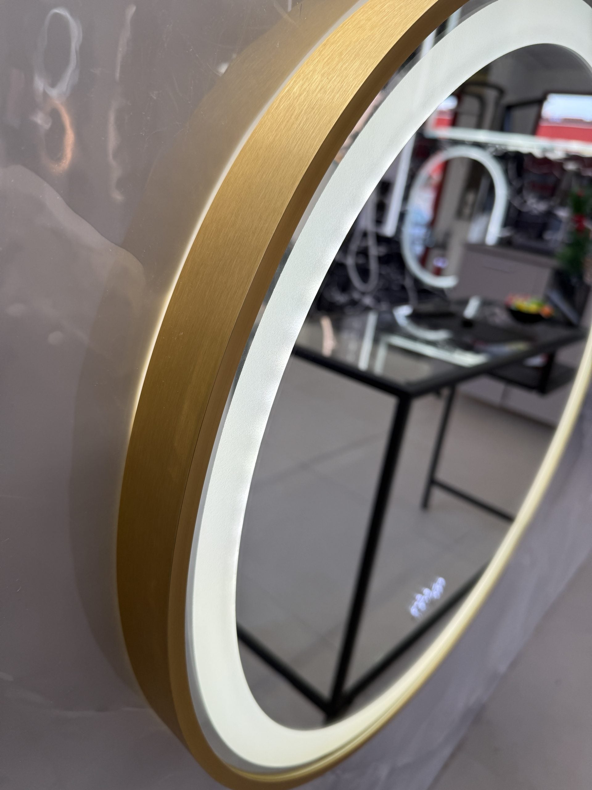 Transformă baia într-un spa modern și funcțional cu oglinda LED rotunda premium de 70×70 cm, cu rama aurie, creată pentru confort, estetică și tehnologie inteligentă. Oglinda este fabricată din sticlă argintie de 5 mm, fără cupru (tehnologie anti-oxidare), cu iluminare dublă (față + margine/spate) și senzori de miscare integrați pentru control total al funcțiilor fara a atinge oglinda.