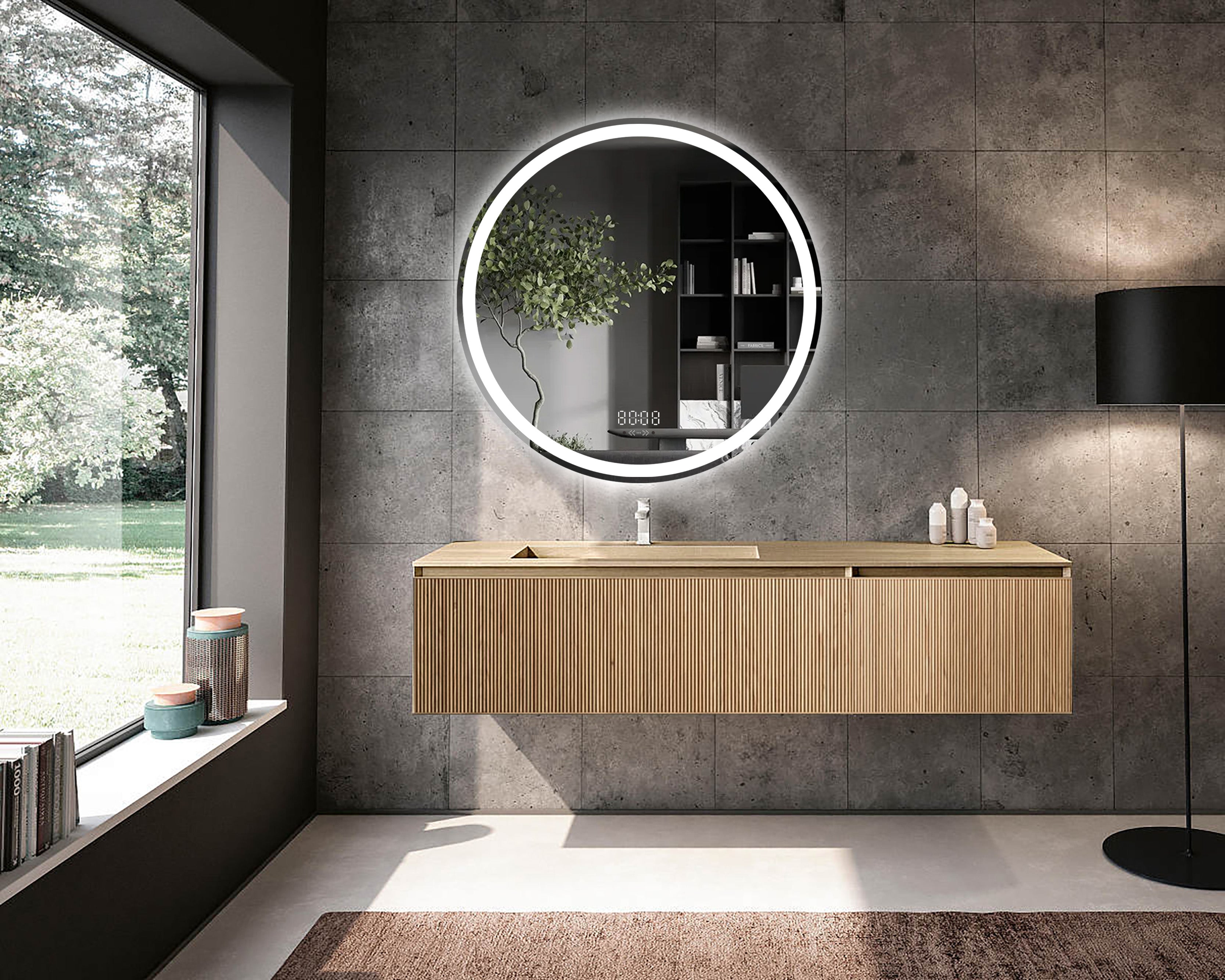 Transformă baia într-un spa modern și funcțional cu oglinda LED rotundă premium de 90×90 cm, creată pentru confort, estetică și tehnologie inteligentă. Oglinda este fabricată din sticlă argintie de 5 mm, fără cupru (tehnologie anti-oxidare), cu iluminare dublă (față + margine/spate) și senzori de miscare integrați pentru control total al funcțiilor fara a atinge oglinda.