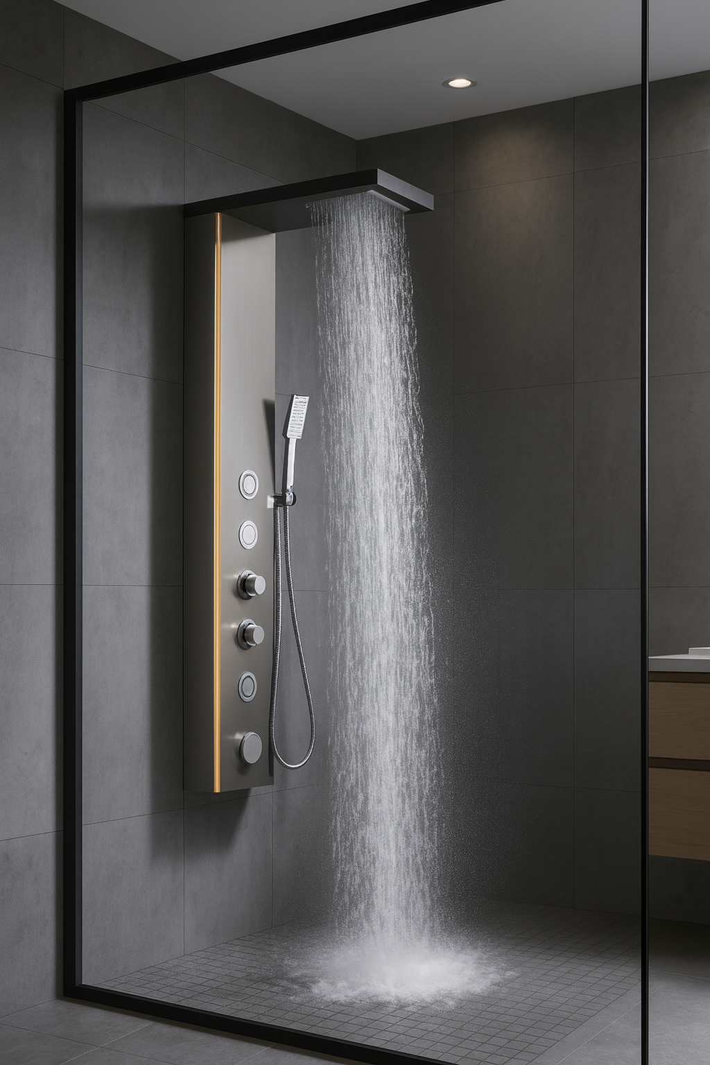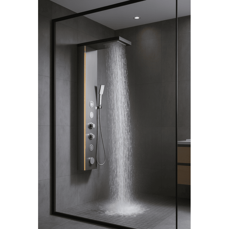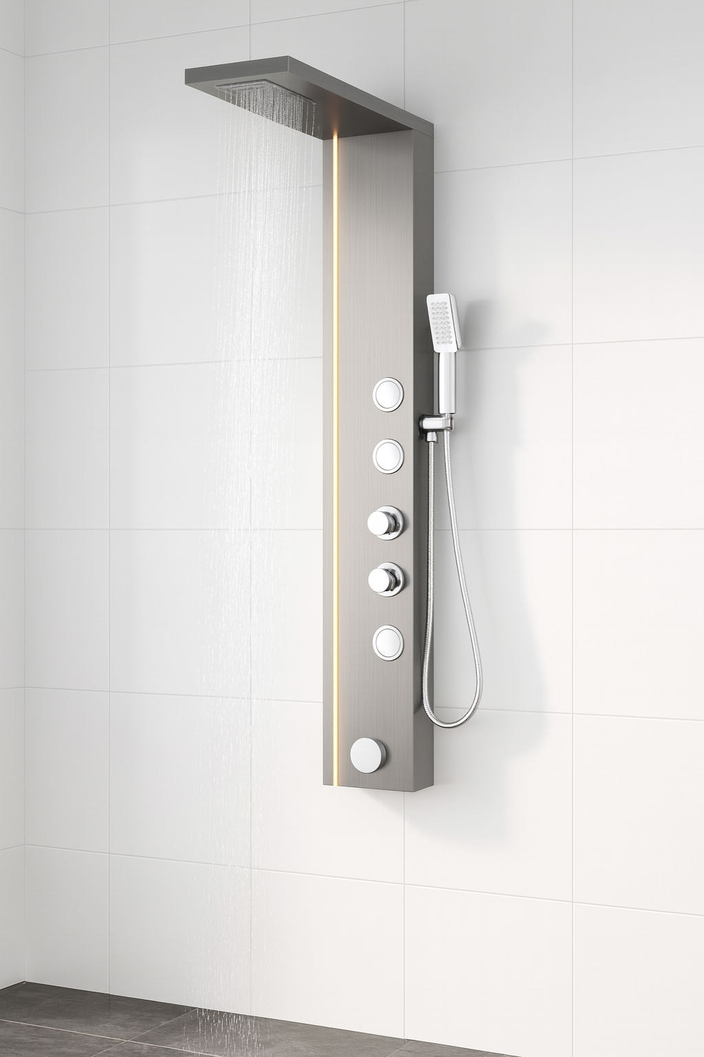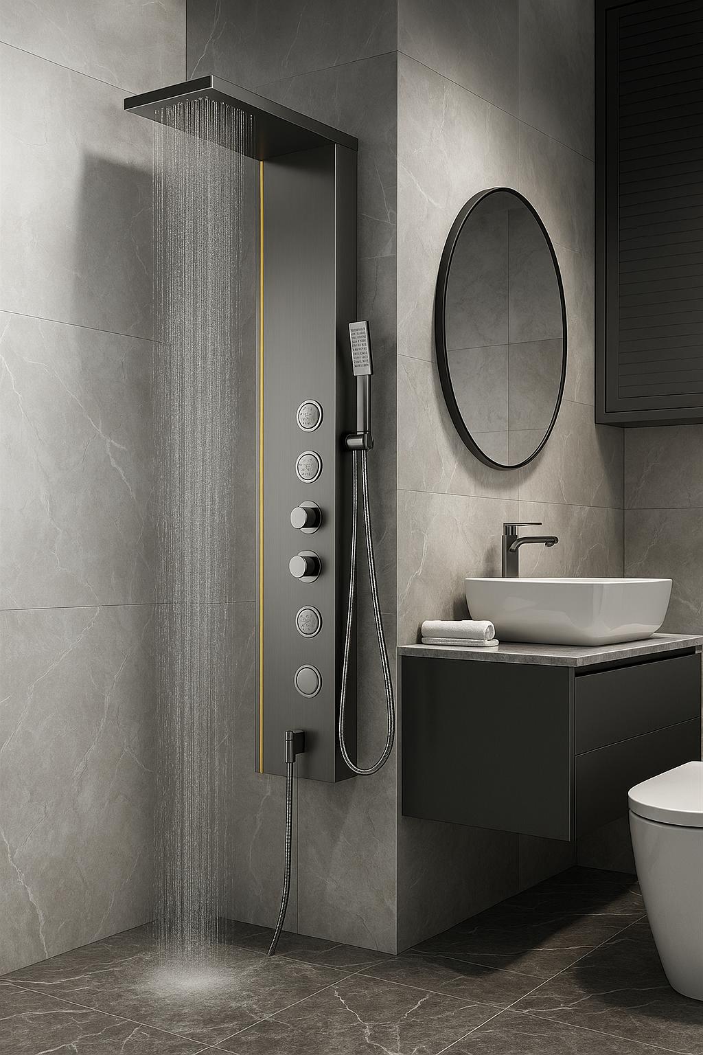 Adaugă lux și funcționalitate băii tale cu acest Panel de Duș modern, echipat cu LED și display digital pentru o experiență de relaxare completă. Designul elegant, negru mat, și funcțiile avansate fac din acest panel alegerea perfectă pentru orice baie contemporană.