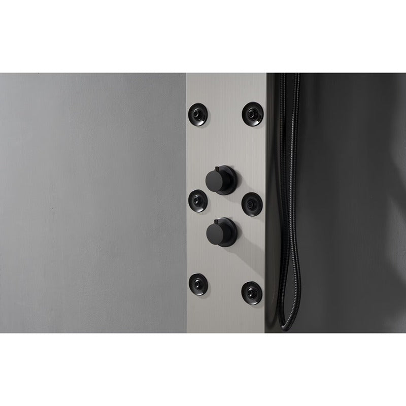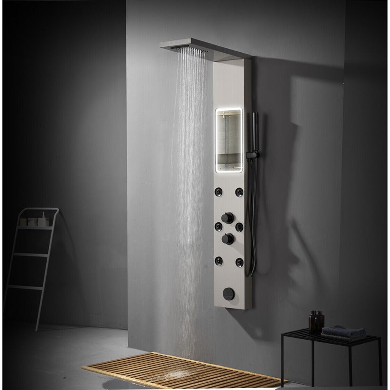 Transformă baia ta într-un spațiu de lux și relaxare cu acest panel de duș premium, echipat cu oglindă iluminată LED și multiple funcții pentru confort maxim.